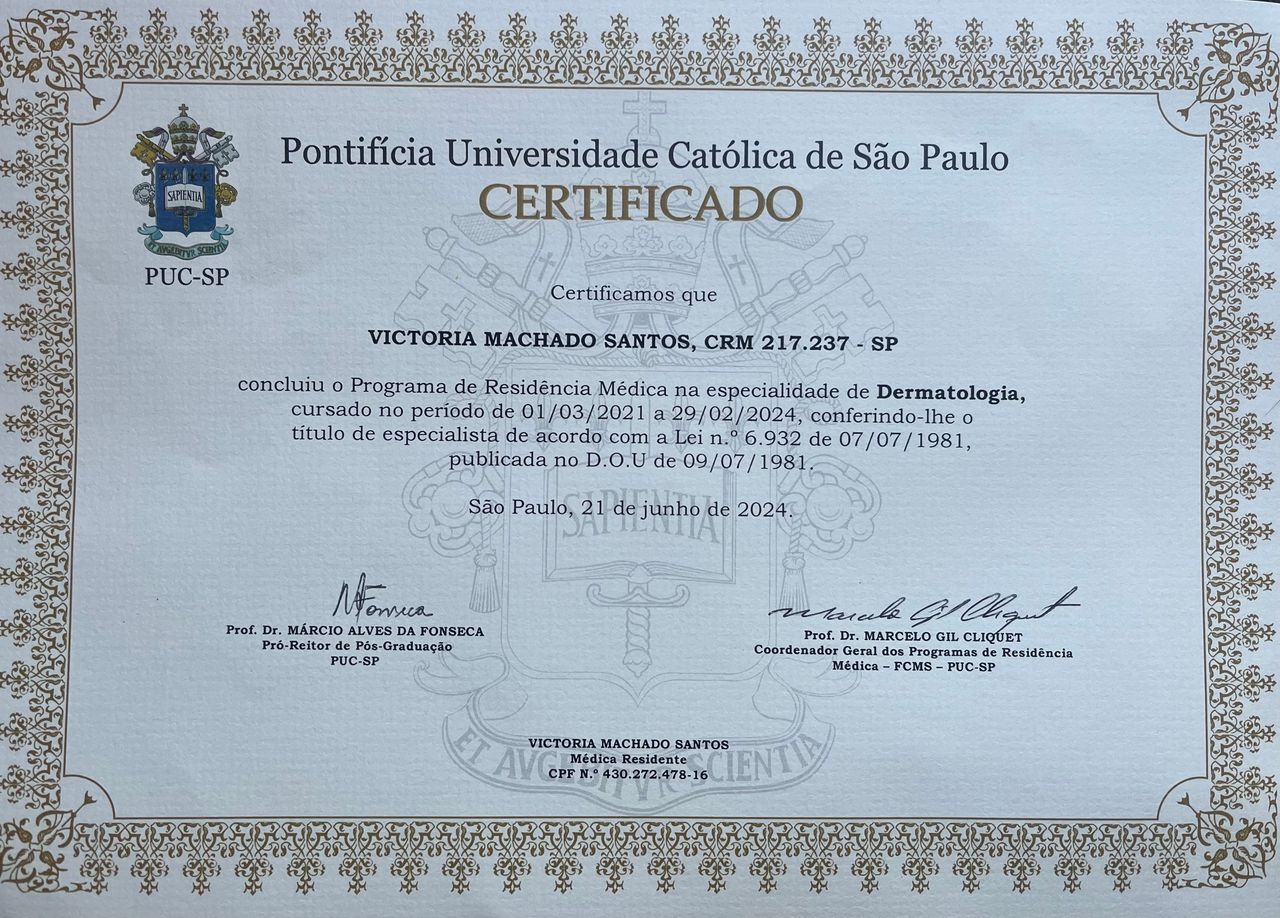- Residência Médica em Dermatologia pela Pontifícia Universidade Católica de São Paulo PUC-SP.